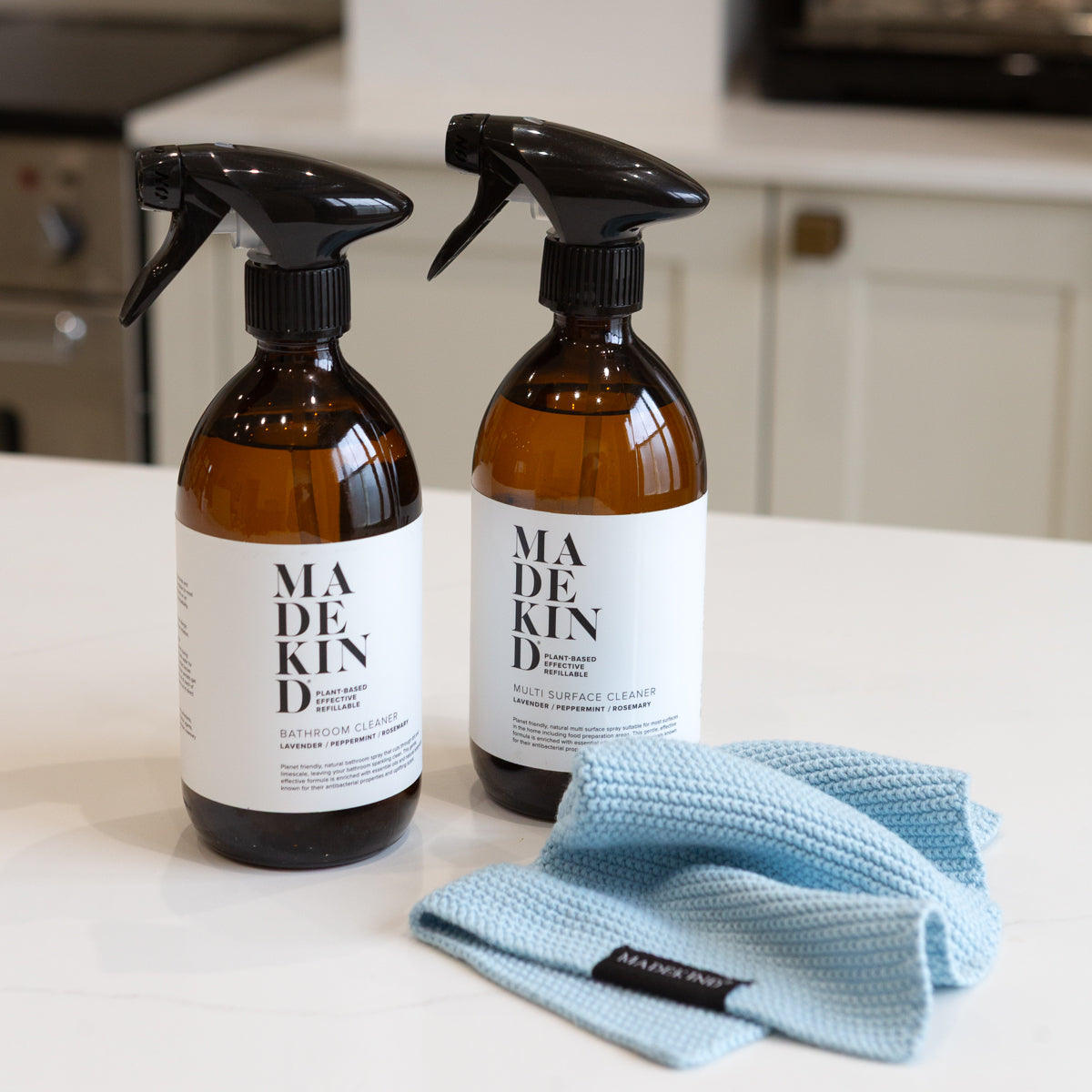 The Cleaning Essentials Starter Kit includes a natural Multi Surface Cleaner, Bathroom Cleaner and organic cleaning cloth in choice of colour.