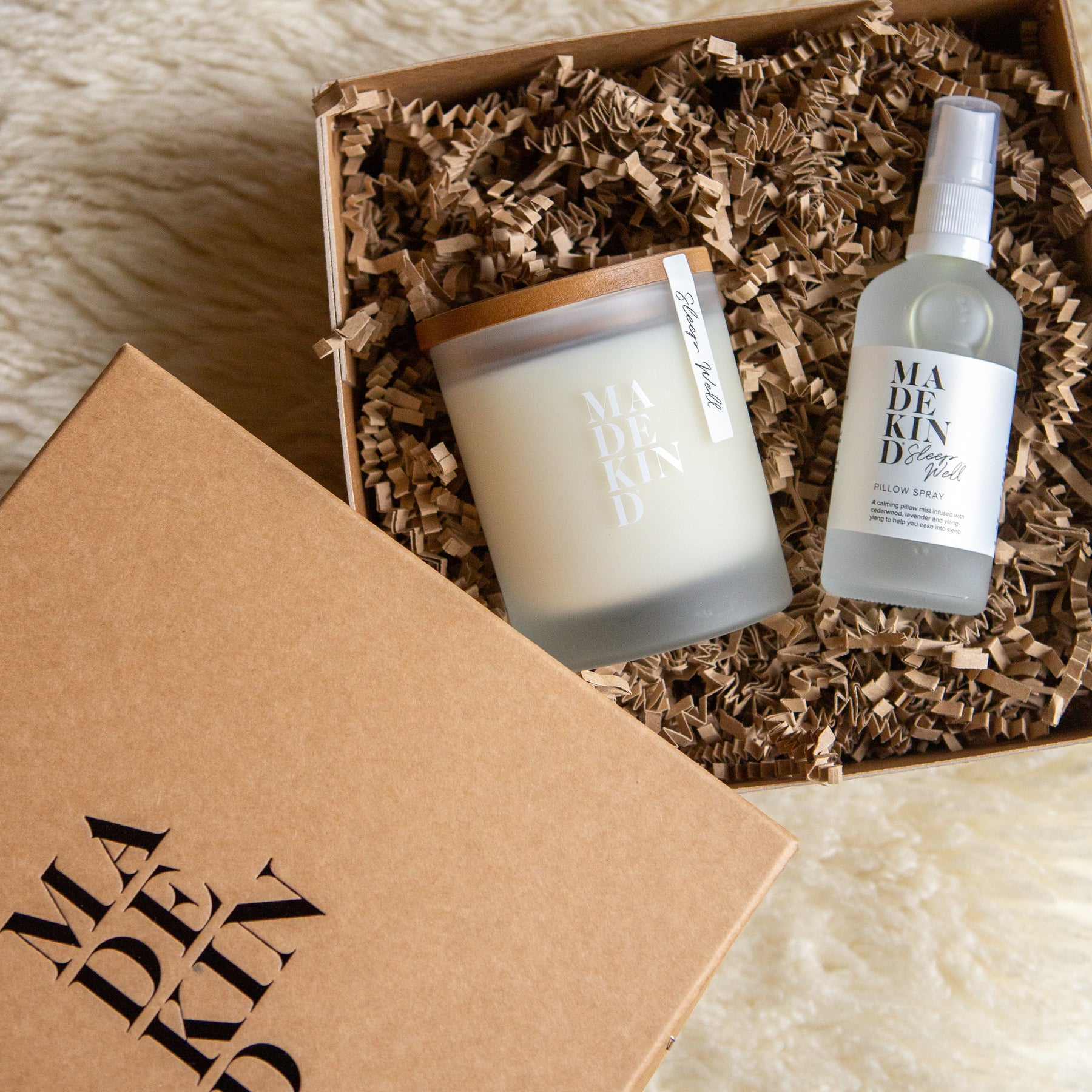 Gift box containing the MadeKind Sleep Well aromatherapy candle and Sleep Well Pillow Mist.