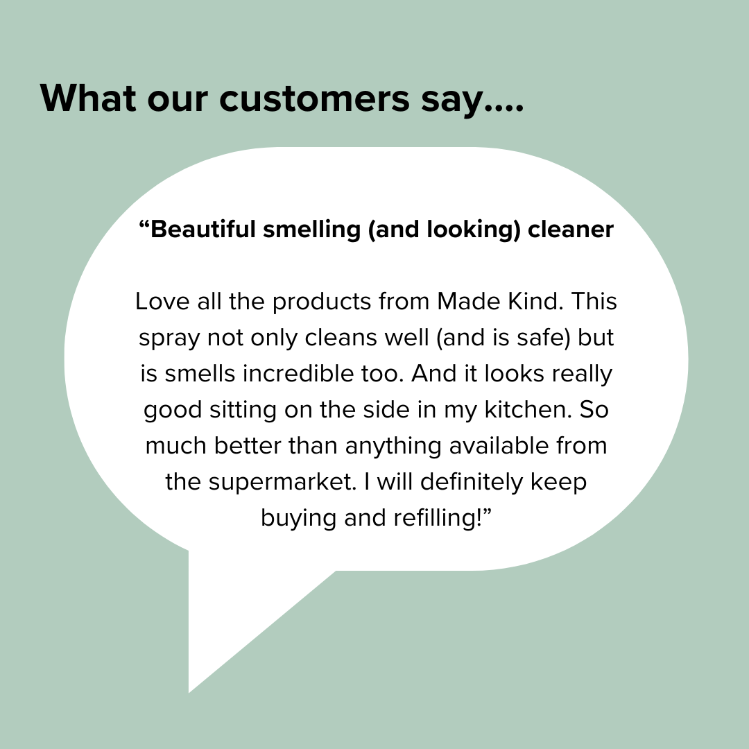After recently becoming anxious about chemicals in the home, I looked online and found this. The smell is divine, the bottle looks beautiful and it has nowreplaced most of my supermarket-bought cleaning products. I feel much more relaxed spraying this now and have bought several as gifts for family and friends. The 3L refill is really helpful and makes you feel much less guilty than before when I was recycling several plastic bottles a month. I will definitely keep using, many thanks for your wonderful ideas. Very best wishes.