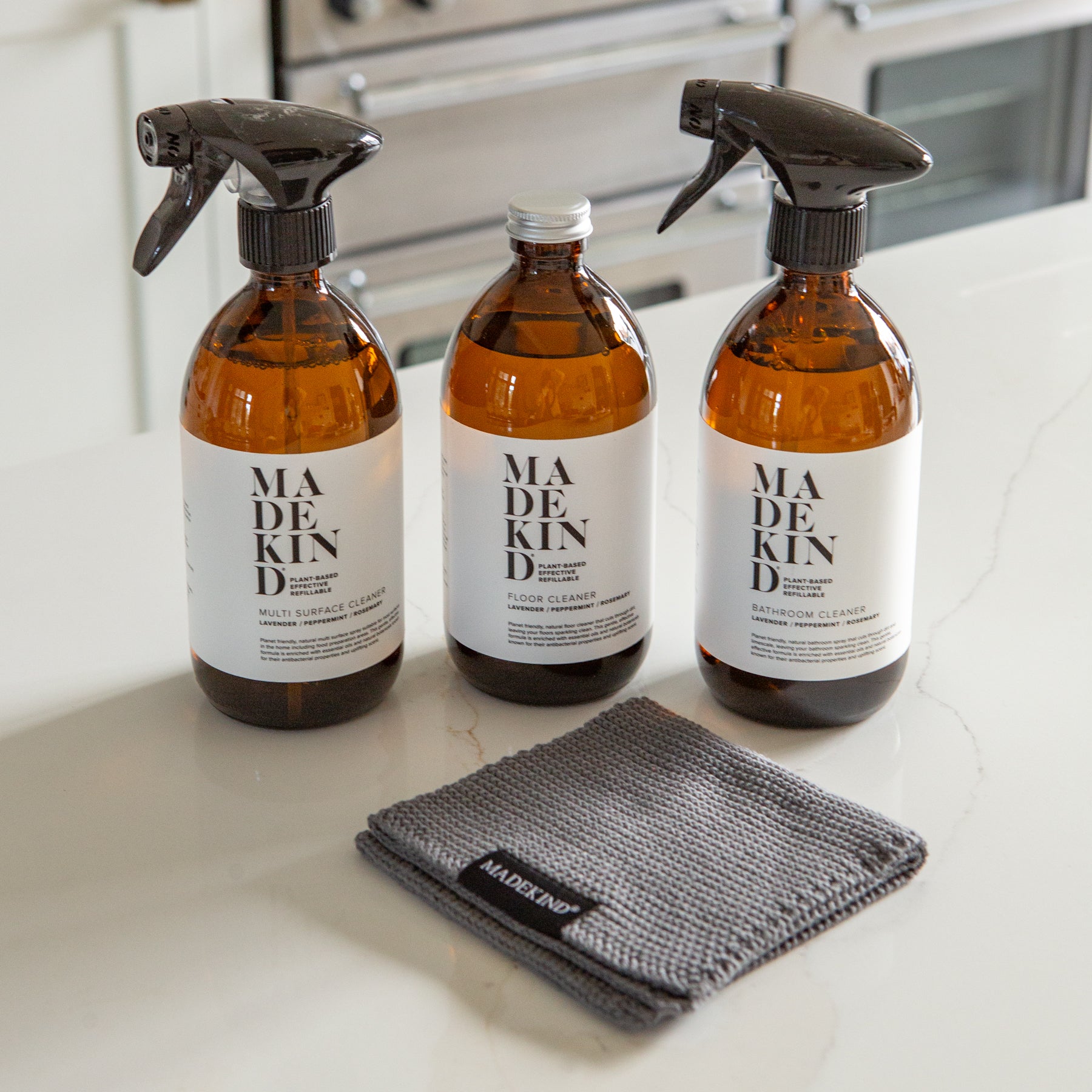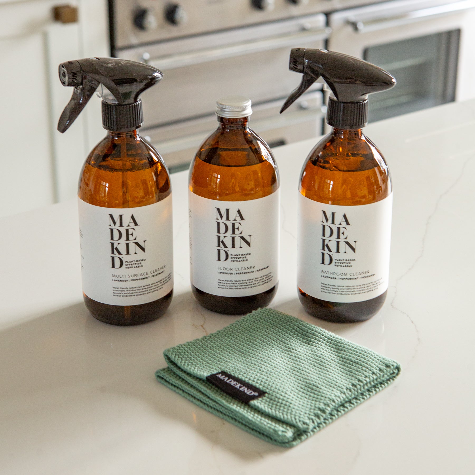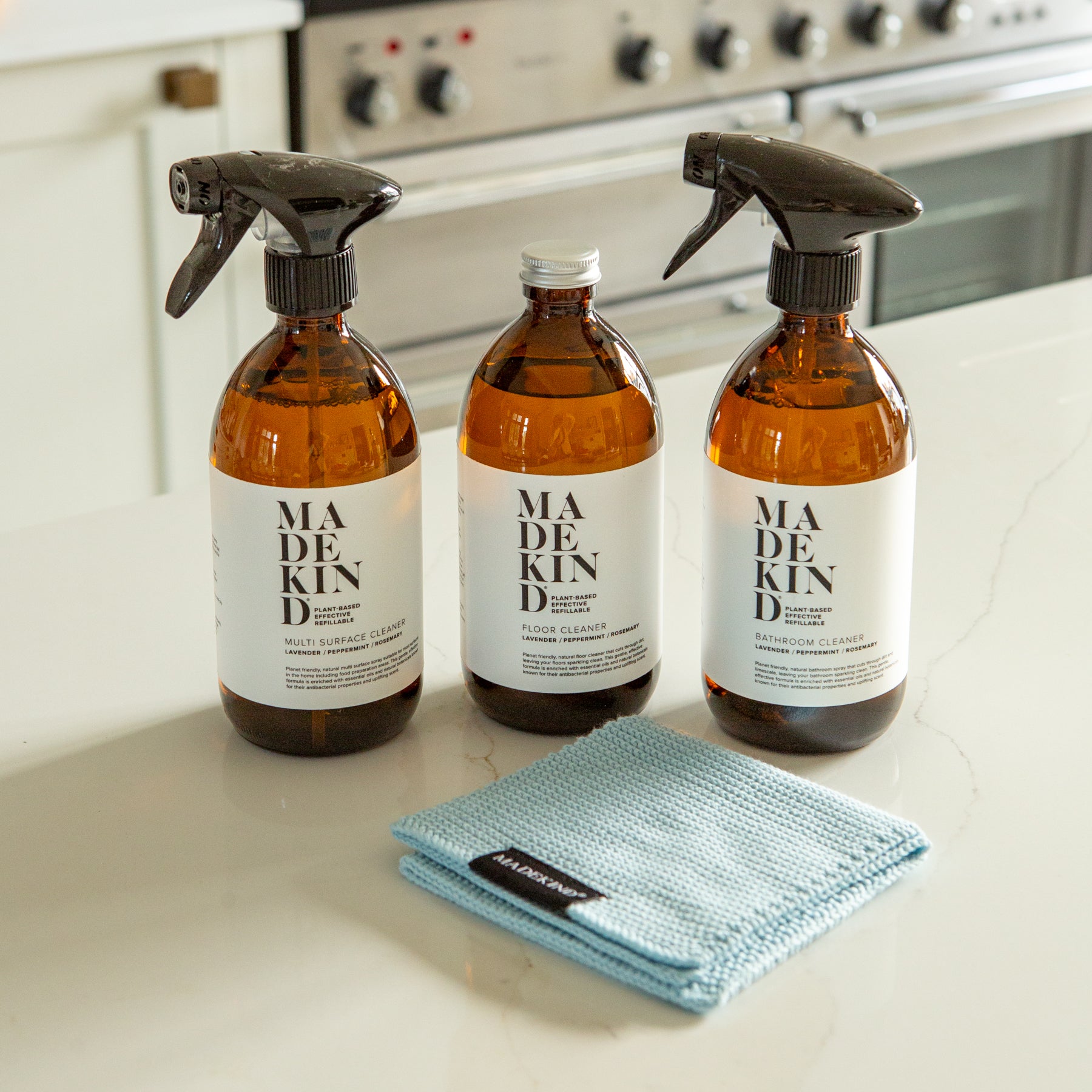 The Spring Cleaning Kit includes a MadeKind Multi Surface Cleaner, Bathroom Cleaner and Floor Cleaner in 500ml amber glass bottles, with a FREE organic cotton, knitted Dishcloth worth £6.