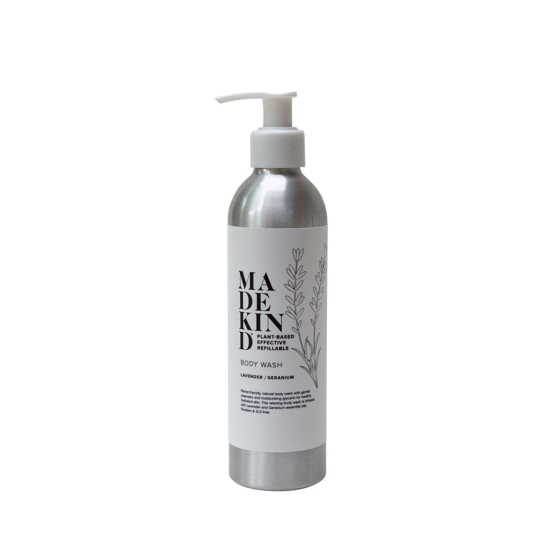 The MadeKind eco body wash is available in 250ml or 500ml aluminium bottles, and can be refilled with our Body Wash 1 litre refill pouches.